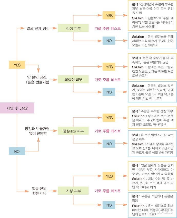 정상 피부라면 이마와 코는 약간 번들거리고, 뺨은 땅김이 없이 편안하다. 반면 전체적으로 건조하거나 유분이 지나치게 많다면 건성·지성으로 구분된다. 중요한 것은 내 피부를 있는 그대로 파악하고, 그에 맞춰 관리법을 조율하는 것이다.
